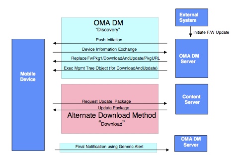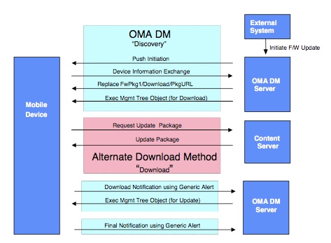 OMA DM是主要针对无线设备的设备管理的领先标准计划。OMA下载规范[DLOTA]提供了一个灵活的协议,允许下载通用内容,通过使用单独的下载描述符进行控制。通过利用这些协议的元素和添加新的元素,构造有效的协议,其组合用于控制主要设备管理功能的设备管理[DMPRO],并且提供使用基于描述符的下载机制来下载更大的二进制对象,例如固件更新。抽象下载过程以允许使用OMA DM(例如,添加/替换)或任何合适的替代下载机制(例如,诸如OMA下载[DLOTA]的基于描述符的下载协议)。